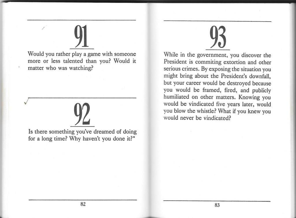 So my answers to The Book of Questions were in line with the same mishmash of weird feelings and naïve confusion that makes up the rest of my journal from when I was sixteen. For what it’s worth, though, the book asks some pretty interesting questions that would make for great introspection fodder from someone with more experience. I’m curious as to how this was used by the adults who bought it. I mean, I imagine that many copies of the book got flipped through and put aside, but I can also see people journaling with it or maybe even busting it out at parties. Can you imagine those? I’m picturing the most narcissistic asshole you know holding court about politics and social issues … which is what your narcissistic asshole relatives do at Thanksgiving … without the help of a book.
