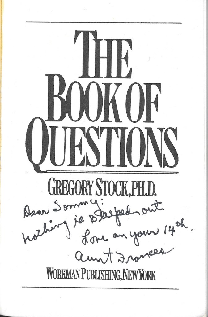 Anyway, Aunt Frances always gave me Christmas and birthday presents, even well into my teenage years when I didn’t really expect much from anyone. Okay, that’s a lie, because I don’t think you ever get over expecting at least something from a relative; you just don’t outwardly express it. I can’t remember the gifts she bought–most likely, they were random action figures or activity packs when Iw as a kid and some sort of chocolate when Iw as older–but one stands out to me because I still own it, which is The Book of Questions.