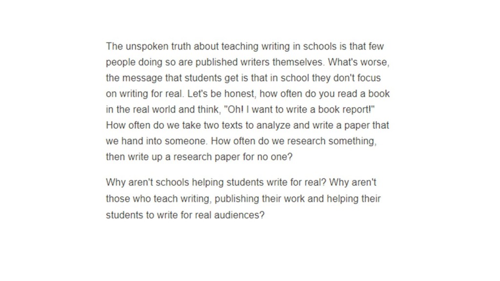 On my phone, there’s a screencap from an old Innovative Educator post that begins “The unspoken truth about teaching writing in school is that few people doing so are writers themselves.”*