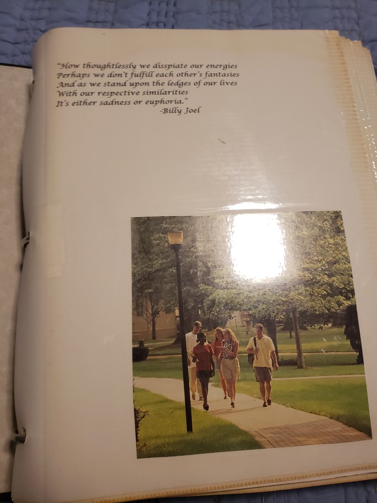 One of the original requirements for Mrs. Taber’s album project was that I had to have some sort of written element. So in the albums that contained my senior year of high school, I wrote accompanying text pieces, which were small essays about a particular event. It might have been how i felt about a particular place I visited, or it might have been a story about making out with a girl from France or how I felt about my girlfriend. I wish i could tell you what led me to being so personal in what I was writing–maybe I felt I couldn’t really talk to my parents so I was confiding in a teacher or maybe the world? Who knows. But years later, those mini-essays would write an essay for my old blog, one that I re-posted to Pop Culture Affidavit in 2014.