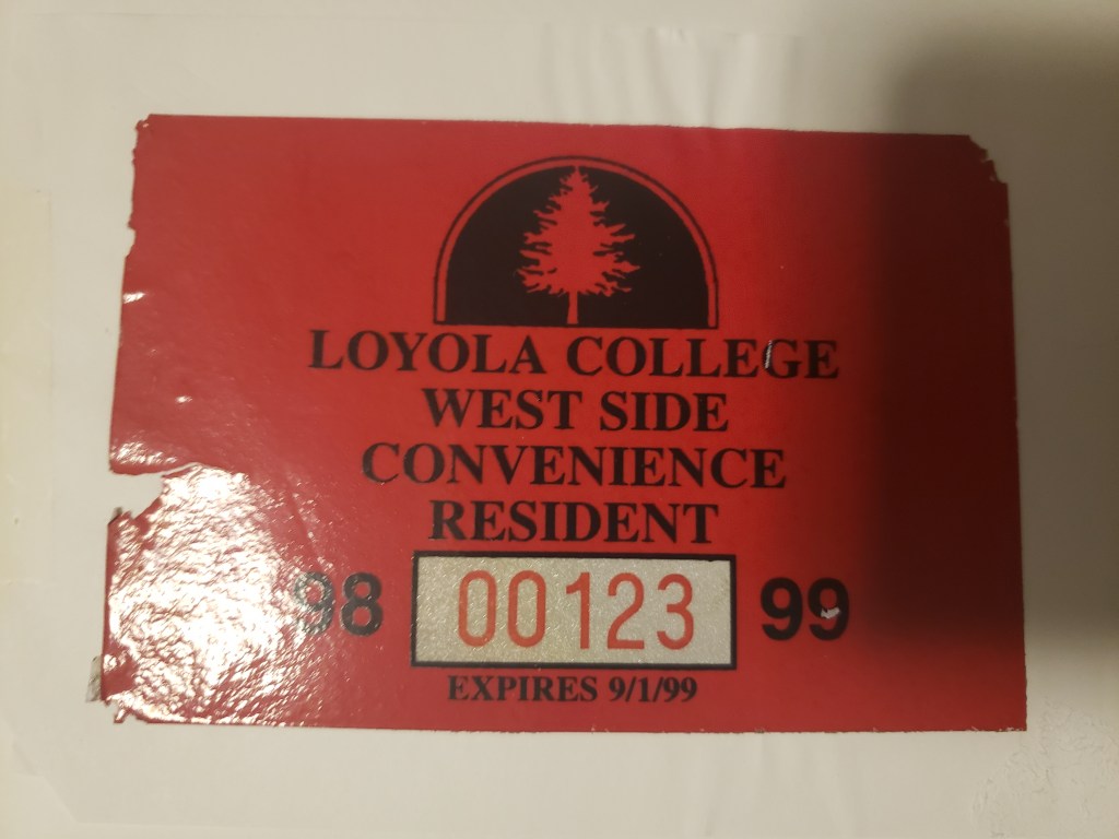 My senior year parking pass. This had been taped to the rear window of my old Hyundai Excel and I’d paid $250 to have it so that i could part in the lot behind my senior year dorm instead of taking a shuttle to a satellite lot. I got told repeatedly how impractical I was being even though I wanted to pay a premium for the convenience of parking. Unless, that is, I was being asked to give someone a ride and then catching shit when I said “no.” Like I said, the most innocuous of things from those years brings up something rotten.