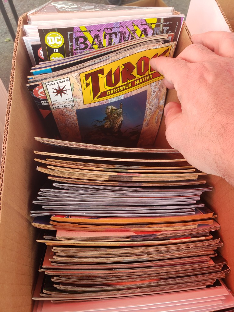Anyway, the piles continue to grow, as do the piles of comics, because I spent $21 at the quarter bin sale in addition to what I grabbed for FCBD. That one was more full of curiosity than interest or fulfilling want lists, even though I snagged a couple of issues of Arak that were not in my collection. And to be honest, the quarter bin sales have the same appeal as FCBD because of the way you can just grab random stuff that you would have never paid full price for. A samurai series from 1980s’ Eclipse Comics? Sure. Random horror or war books? Absolutely? Turok: Dinosaur Hunter #1? Well, that’s just in the quarter bin because it’s required by law.