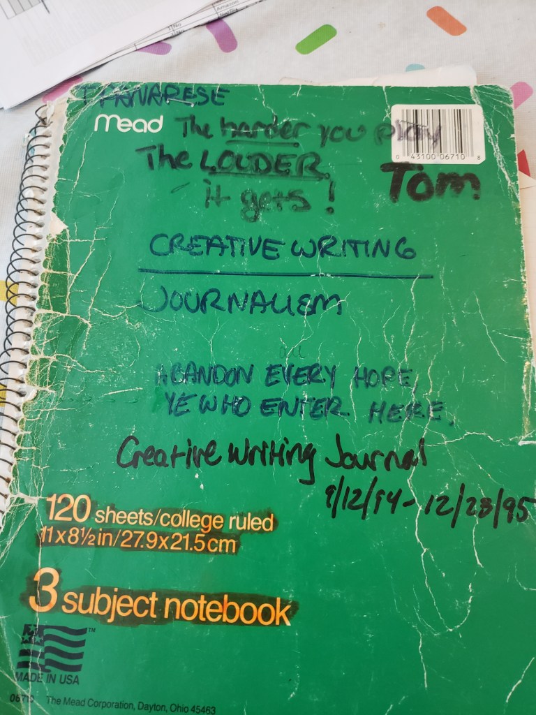 It’s kind of true? Because when I took that class, I disocvered that I really had some ability to write. It also happens to be where the first of those 30 years’ worth of notebooks begins. I’ve decided to get rid of them, but not before I take one last look at what is in there, and the first two of them proved to be really interesting because they were the actual notebooks for that class and the rest of my senior year, starting in September 1994 and ending in August 1995, which was about a week before I headed off to school in Baltimore.