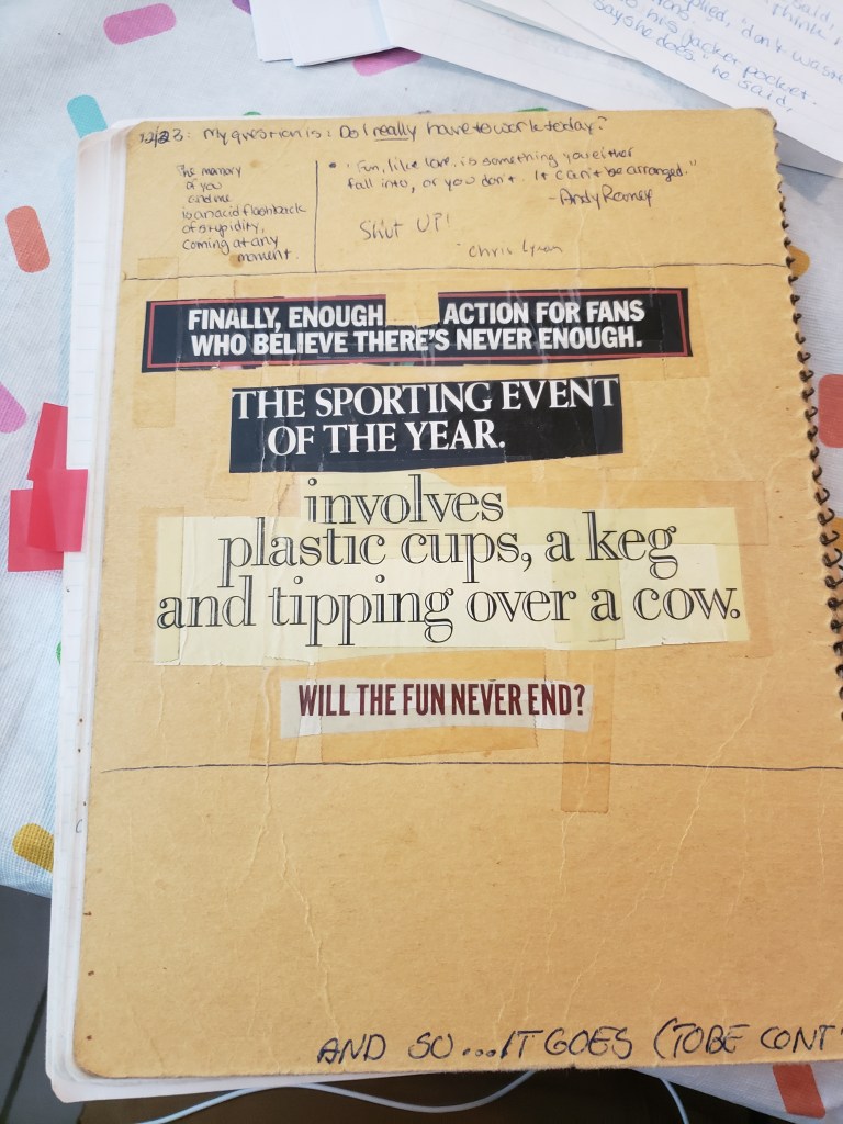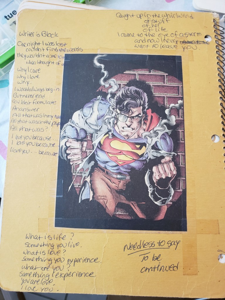 The front and back covers of my journals these days are nondescript. My name is in the top left corner, “Creative Writing Journal” is in the center, and the date started and ended are below that. These two have a little more to them and kind of crack me up. I had been trying so hard to be the “clever one” when I was 17, so quoting Dante in a tongue-in-cheek manner and also writing “The harder you play, the louder it gets”, which I found on the back of a Coed Naked Rock and Roll T-shirt (I didn’t own that one, but I did have hockey and billiards coed naked T-shirts). And the back of the notebooks have a collage ofmagazine ads cut from an issue of Sports Illustrated to create some sort of saying (maybe it’s poetry these days? Who knows) as well as a Superman #100 image cut from an issue of Previews. The front cover of Journal II was less cheeky–simply a quote from my friend Vanessa about dorkiness. if you have followed me since I started Pop Culture Affidavit, you’ll know that this is a mantra of mine.
